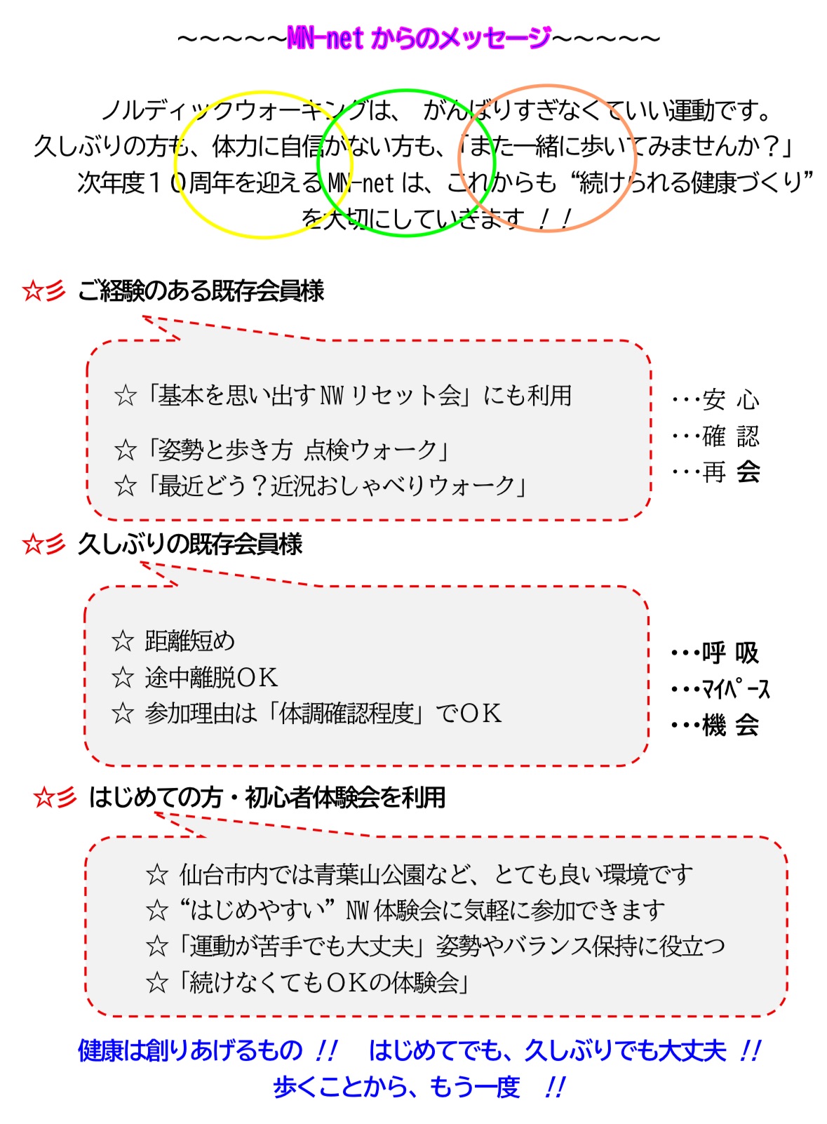 MN-netでは、みちのく公園との共催で「ノルディックウォーキングさわやか健康講座」を開催しています。