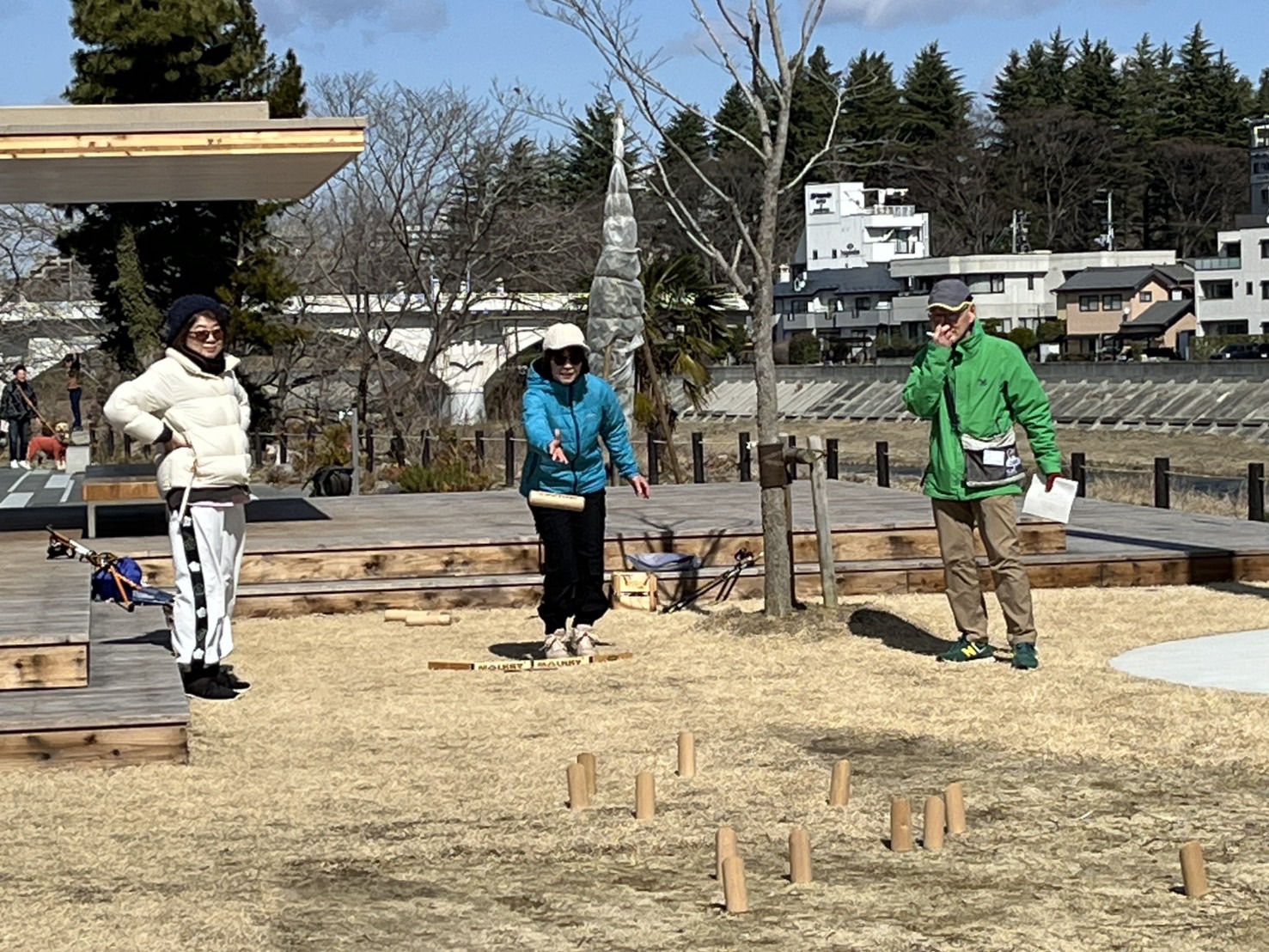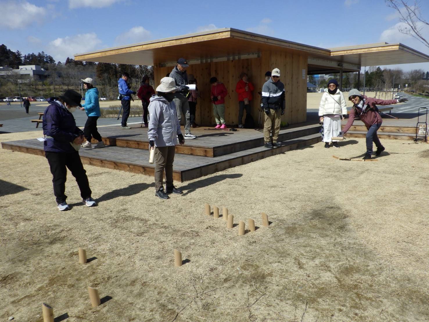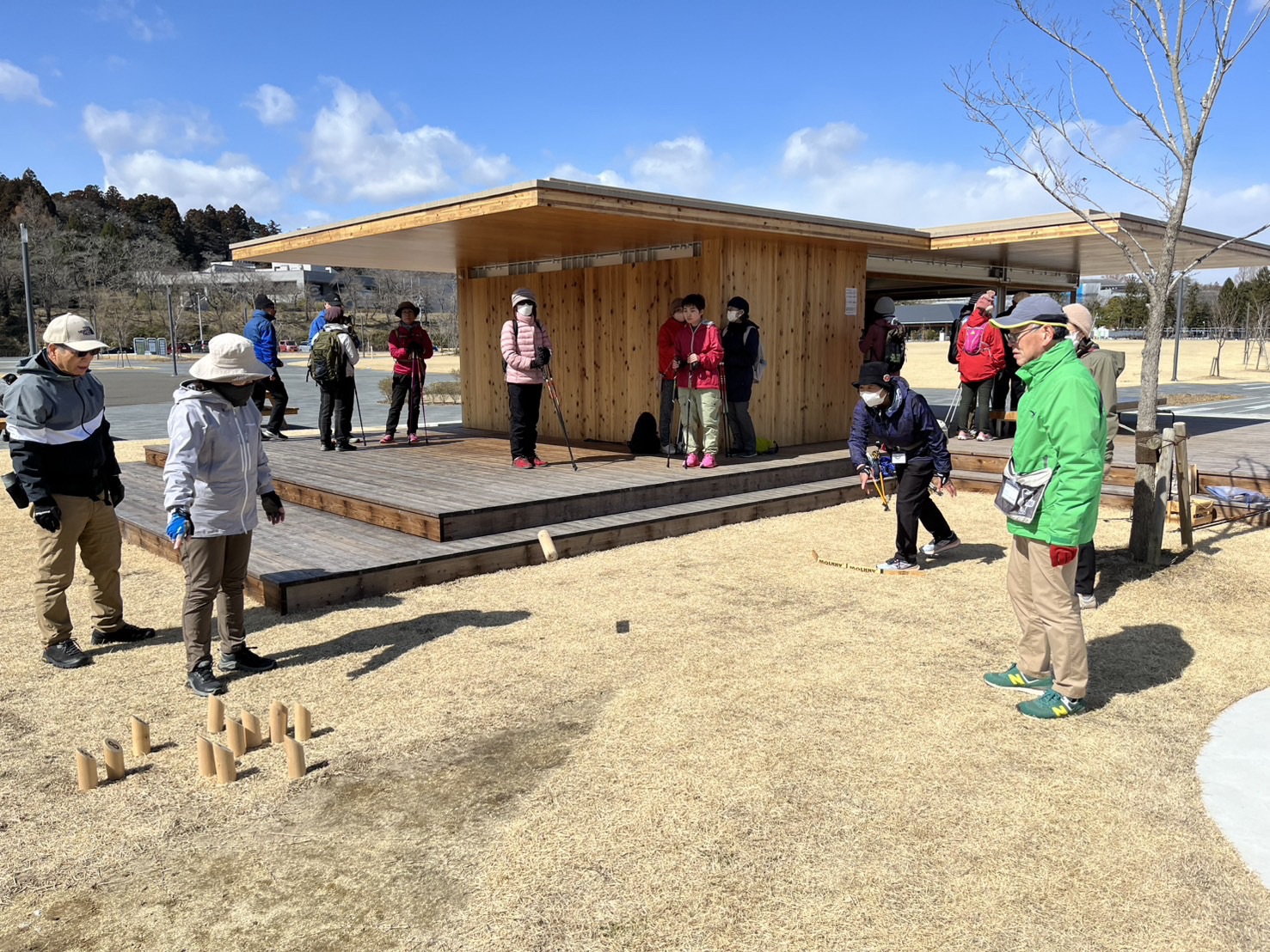ノルディックウォーキングをしていた方は、公園内に戻ってきてから短い間でしたがモルックを体験してもらいました。